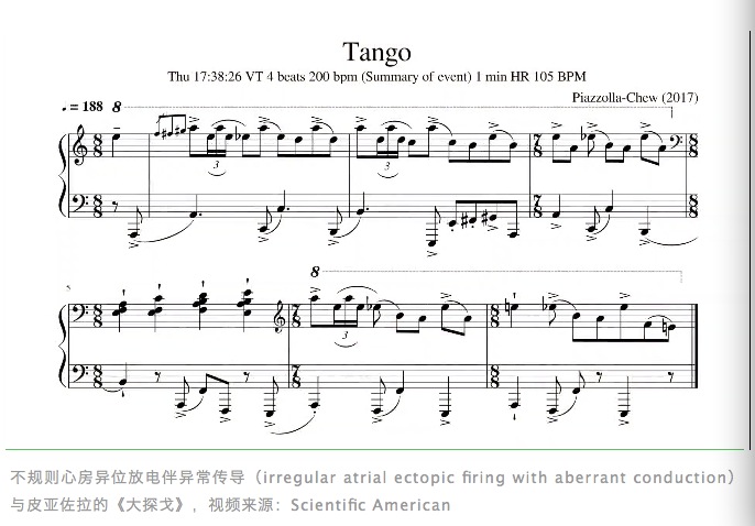 伊莱恩·丘选择用经典的音乐片段来表示心电图(ECG)中心律失常的特征节奏。比如布鲁贝克(Brubeck)的《土耳其蓝色回旋曲》(Blue Rondo à la Turk)有着2:4:3的节奏,这与早搏的特征节奏相匹配;皮亚佐拉(Piazzolla)的《大探戈》(Le Grand Tango)的混音效果,对应着房颤的不规则节奏。伊莱恩还创作了一系列以心电异常为基础的钢琴短曲,配有心脏病专家兰比亚斯的解说。在优美的音乐声中,让普通人也能轻松地听明白心脏的电异常。