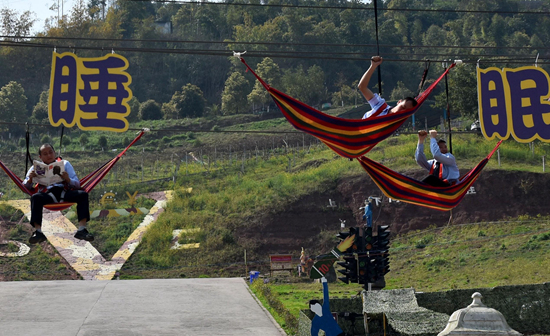 2019年3月20日,为迎接“世界睡眠日”,重庆涪陵红酒小镇举行了挑战高空吊床试睡活动。通过行为艺术的方式,呼吁大家放下电子设备,投入更多时间参与运动、享受优质的睡眠。视觉中国供图