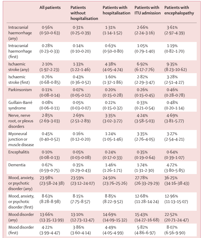 神经系统疾病的诊断比较少见。整个COVID-19队列中,颅内出血的估计发生率为0.56%,缺血性卒中的估计发生率为2.10%。0.11%为帕金森病,0.67%为痴呆症。这些情况在重症新冠患者(例如入住ITU的患者)中更容易出现。