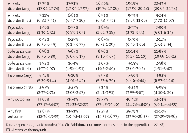 结果显示,在236 379名COVID-19确诊患者中,在随后的6个月内神经或精神诊断的估计发生率为33.62%,其中12.84%的患者为初次诊断。对于曾入住ITU的患者,发生率为46.42%。
