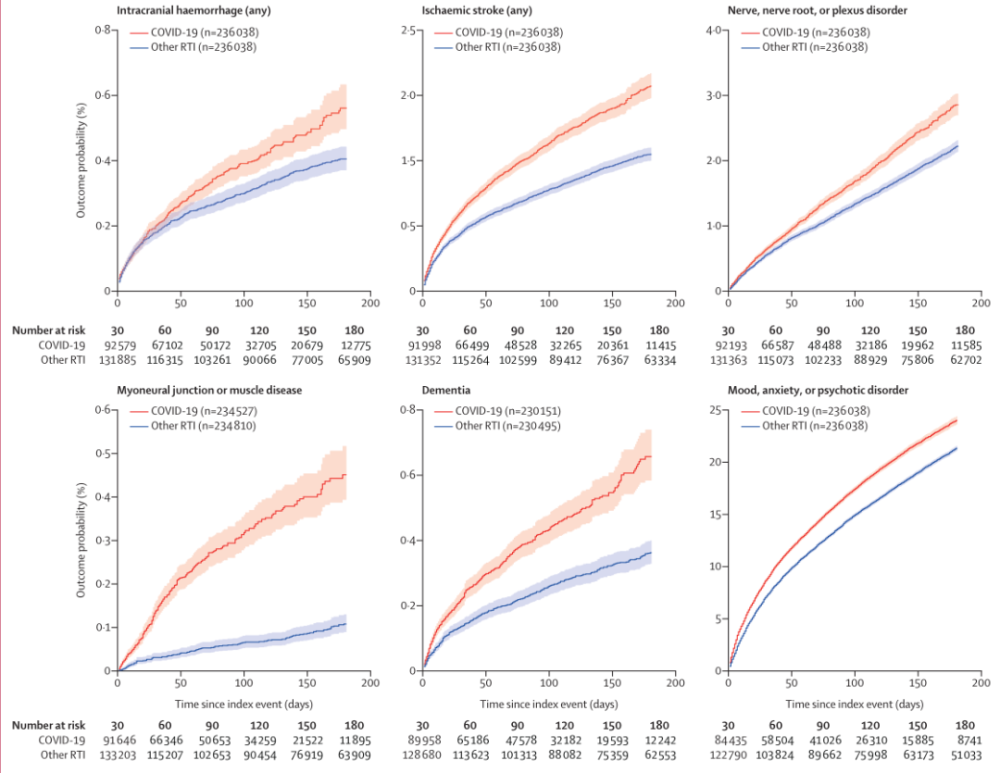和同一时间段内从其他呼吸道感染疾病中康复的人进行数据相比后发现,COVID-19幸存者的心理和神经系统疾病发生率更高[(危险比[HR]1.44%,任何诊断;1.78%,任何首次诊断)vs.(1.16%,任何诊断;1.32%,任何首次诊断)],表明这些疾病似乎与COVID-19病毒有特别的关联性。