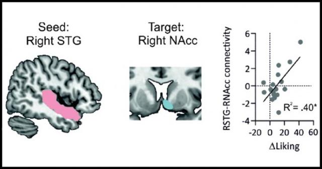 在听音乐之前刺激奖赏回路会增加听音乐时的愉悦感,而抑制它则会降低愉悦感。这些被诱导的愉悦感变化跟伏隔核--奖赏回路的关键区域--的活动变化有关。快乐程度差异最大的参与者在听觉和奖励区域的同步活动上也表现出最大的差异。