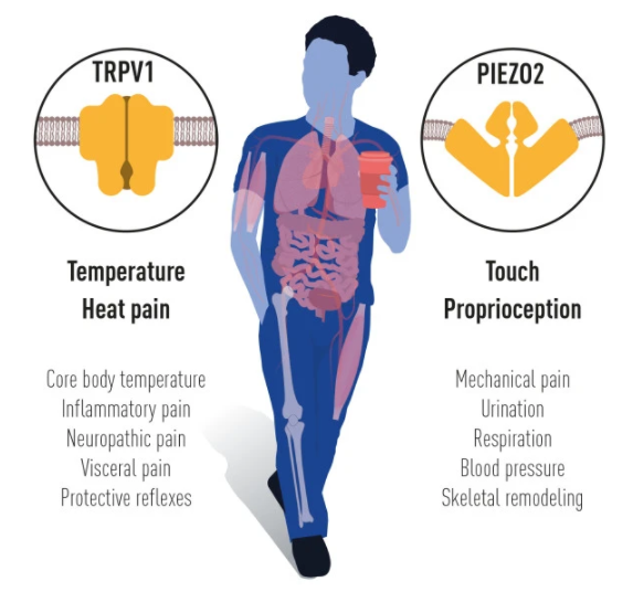 今年诺贝尔奖获得者对TRPV1、TRPM8和Piezo通道的开创性发现使我们理解了热、冷和触觉是如何启动了神经冲动,使我们能够感知和适应我们周围的世界。TRP 通道使我们能够感知温度,Piezo2 通道使我们能够感知触觉和动觉,而且TRP 和 Piezo 通道还有助于许多其他生理功能的发挥。今年诺贝尔生理学或医学奖获奖项目——温度和触觉感受器的研究,其侧重点在于阐明温度感受器、触觉感受器在各种生理过程中如何发挥作用。这一研究发现正被用于开发各种疾病的治疗方法,包括慢性疼痛的治疗。