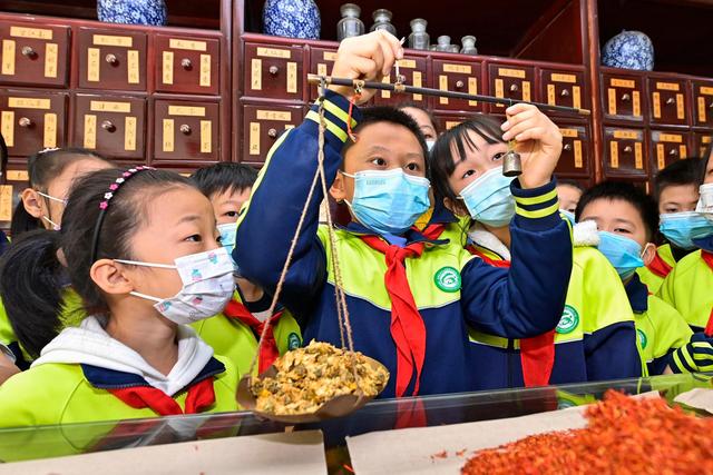 10月20日是世界传统医药日,各地开展活动让学生们了解中医药知识,感受传统中医药文化的魅力。图为在山东省青州市一家中药店,学生在体验称量中草药。新华社发(王继林 摄)