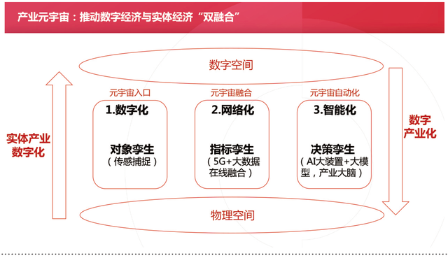 数字空间的虚拟工厂与物理空间的实体工厂实时同步,线上检测异常、优化方案、仿真测试,线下小批量验证、大规模推广。产业元宇宙从数据入口、网络融合、智能自动化逐步升级成熟,共同推进“实体产业数字化”和“数字产业化”。