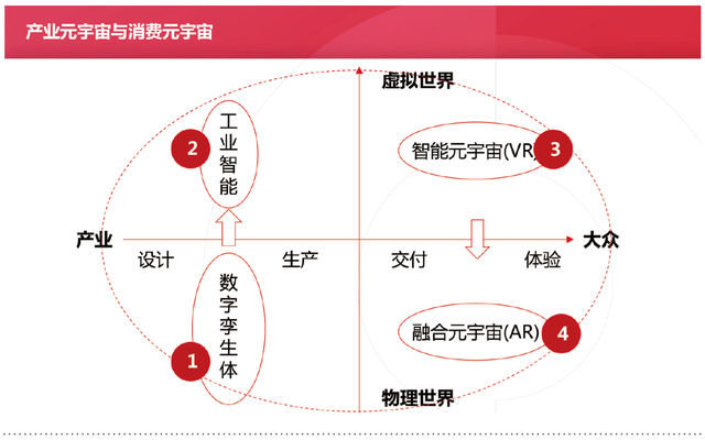 如果说消费元宇宙追求大众客户的极致体验,产业元宇宙则追求极致效率与成本。前者通过VR、AR等仿真技术来实现更“真实”的消费者服务环境与沉浸式体验,后者则通过数字孪生、工业智能技术实现产业流程再造与产业能效持续提升。